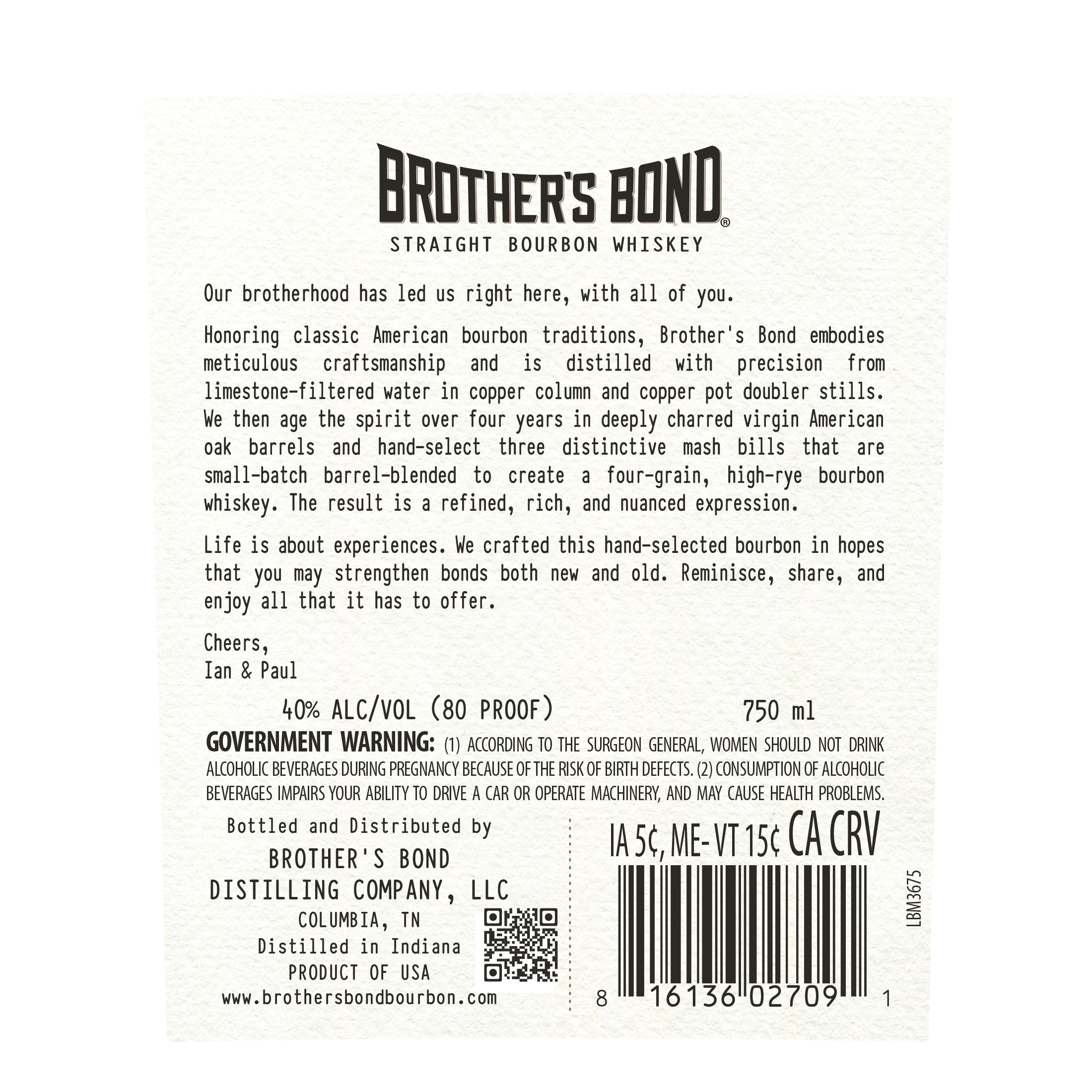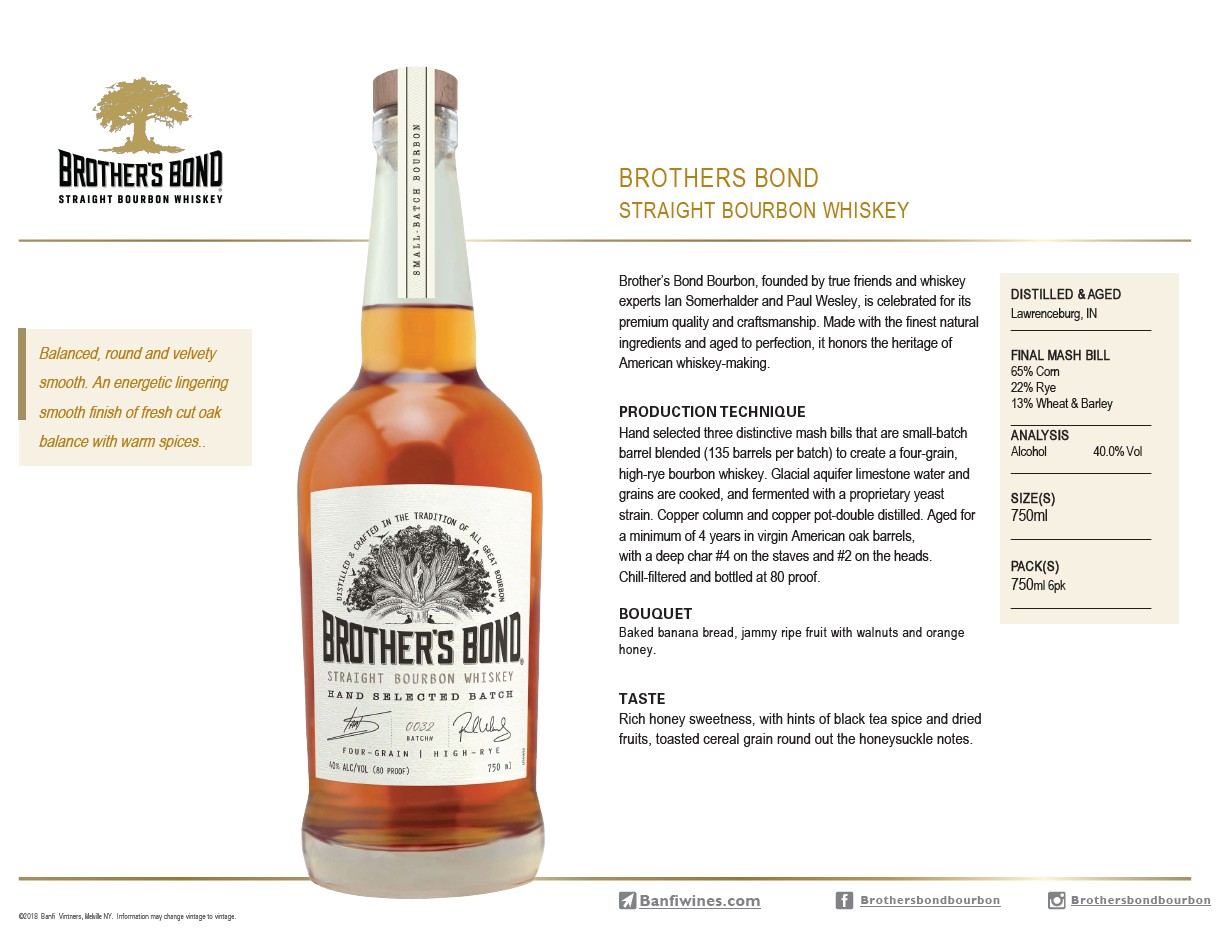 Brother’s Bond Bourbon, founded by true friends and whiskey experts Ian Somerhalder and Paul Wesley, is celebrated for its premium quality and craftsmanship. Made with the finest natural ingredients and aged to perfection, it honors the heritage of American whiskey-making. Committed to sustainability, Brother’s Bond donates a portion of proceeds to regenerative agriculture with every bottle sold.
