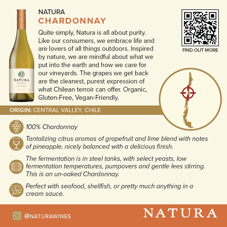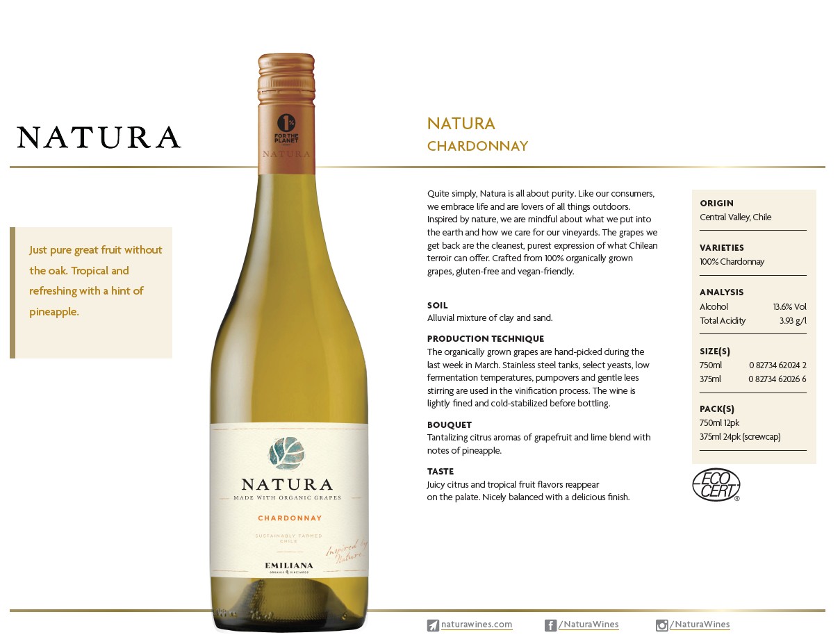 Quite simply, Natura is all about purity. Like our consumers, we embrace life and are lovers of all things outdoors. Inspired by nature, we are mindful about what we put into the earth and how we care for our vineyards.