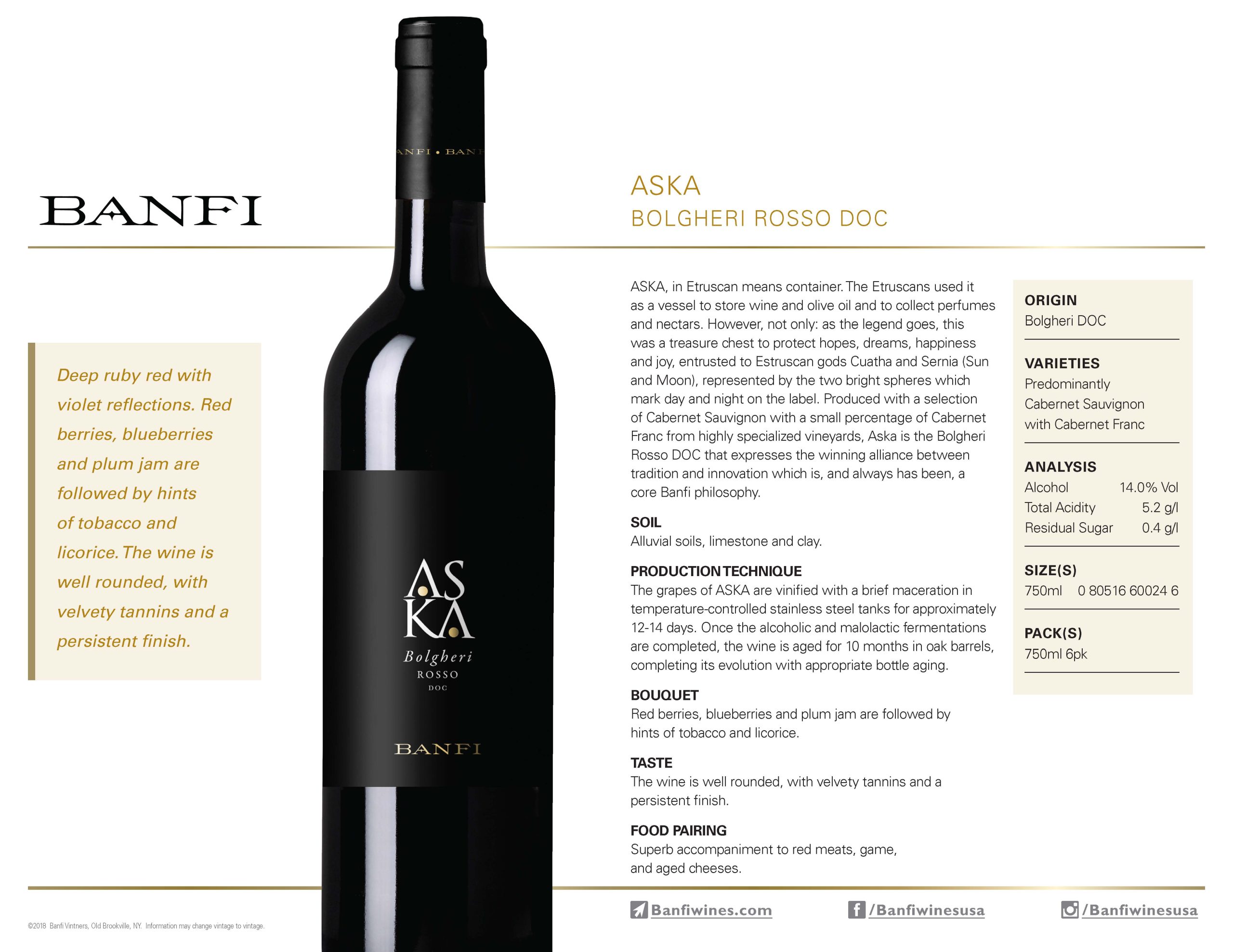 However, not only as the legend goes, this was a treasure chest to protect hopes, dreams, happiness and joy, entrusted to Estruscan gods Cuatha and Sernia (Sun and Moon), represented by the two bright spheres which mark day and night on the label. Produced with a selection of Cabernet Sauvignon with a small percentage of Cabernet Franc from highly specialized vineyards, Aska is the Bolgheri Rosso DOC that expresses the winning alliance between tradition and innovation which is, and always has been, a core Banfi philosophy.