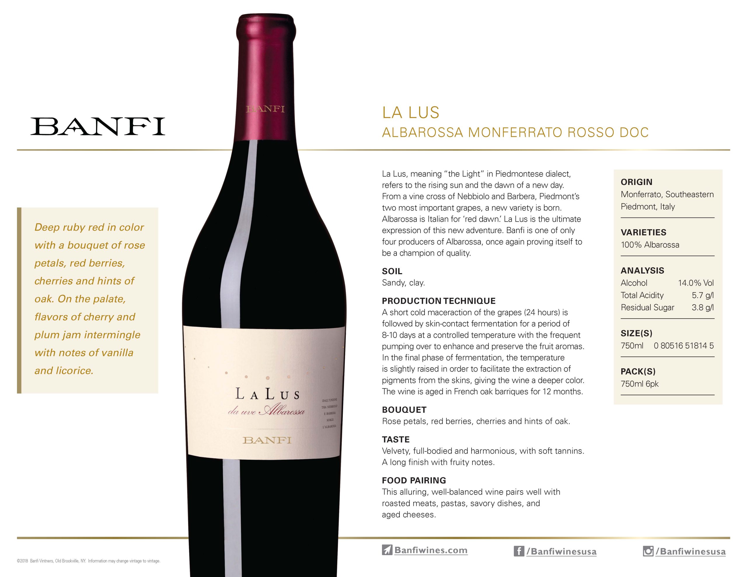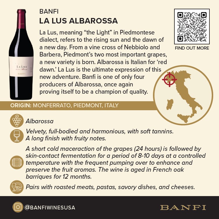 La Lus is the ultimate expression of this new adventure. Banfi is one of only four producers of Albarossa, once again proving itself to be a champion of quality.