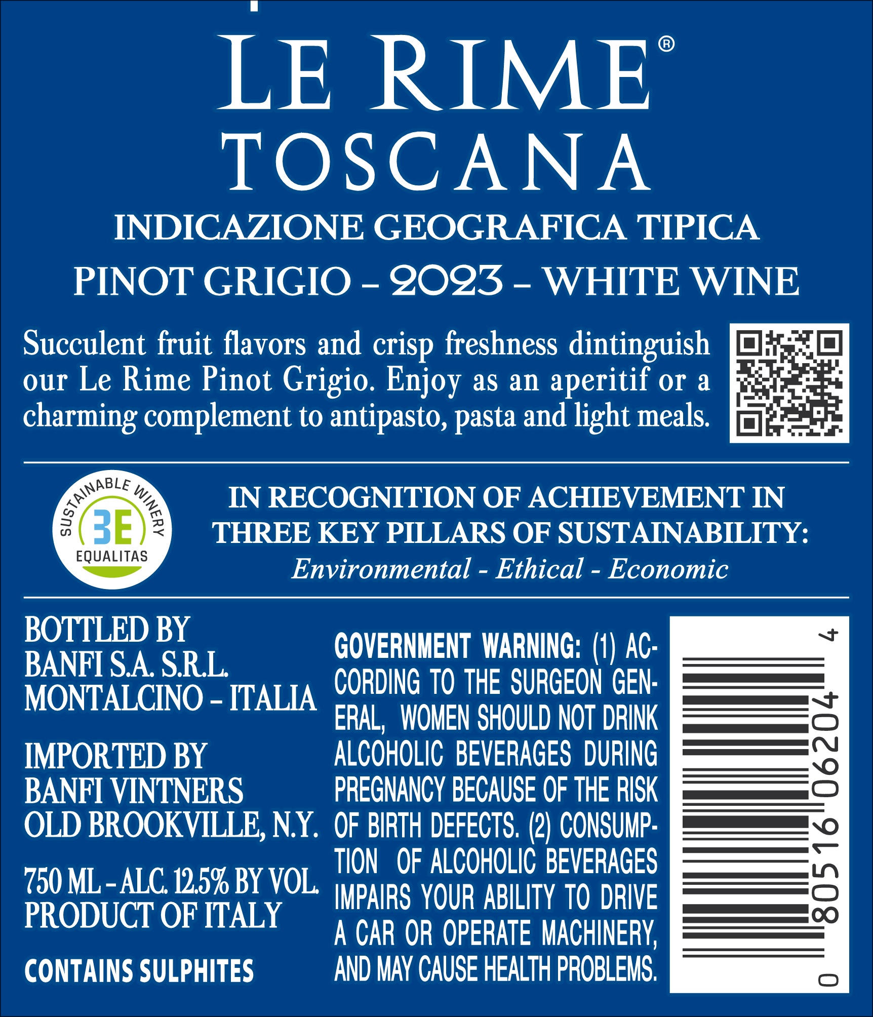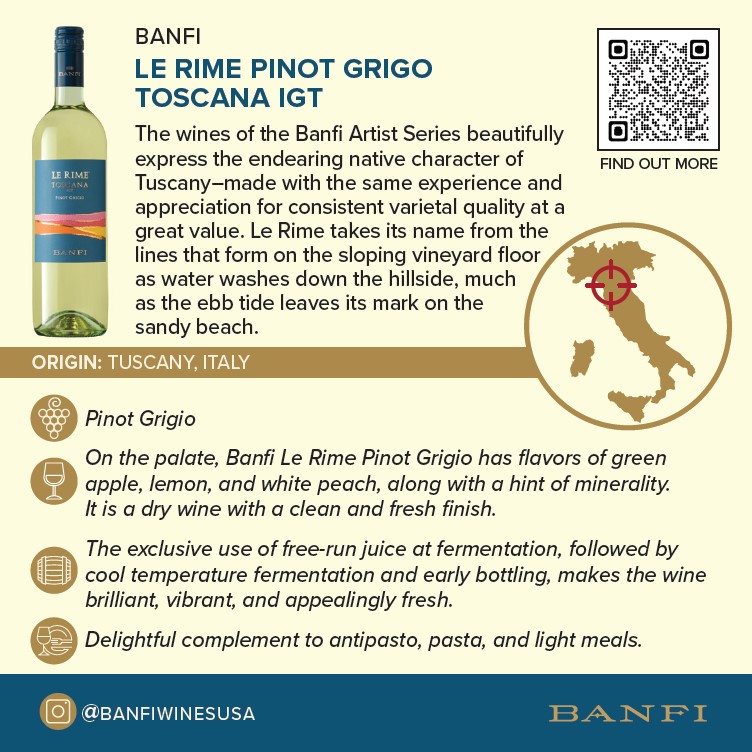 Le Rime takes its name from the lines that form on the sloping vineyard floor as water washes down the hillside, much as the ebb tide leaves its mark on the sandy beach. This Pinot Grigio catches that fresh minerality inherent to the terrain of southern Tuscany.