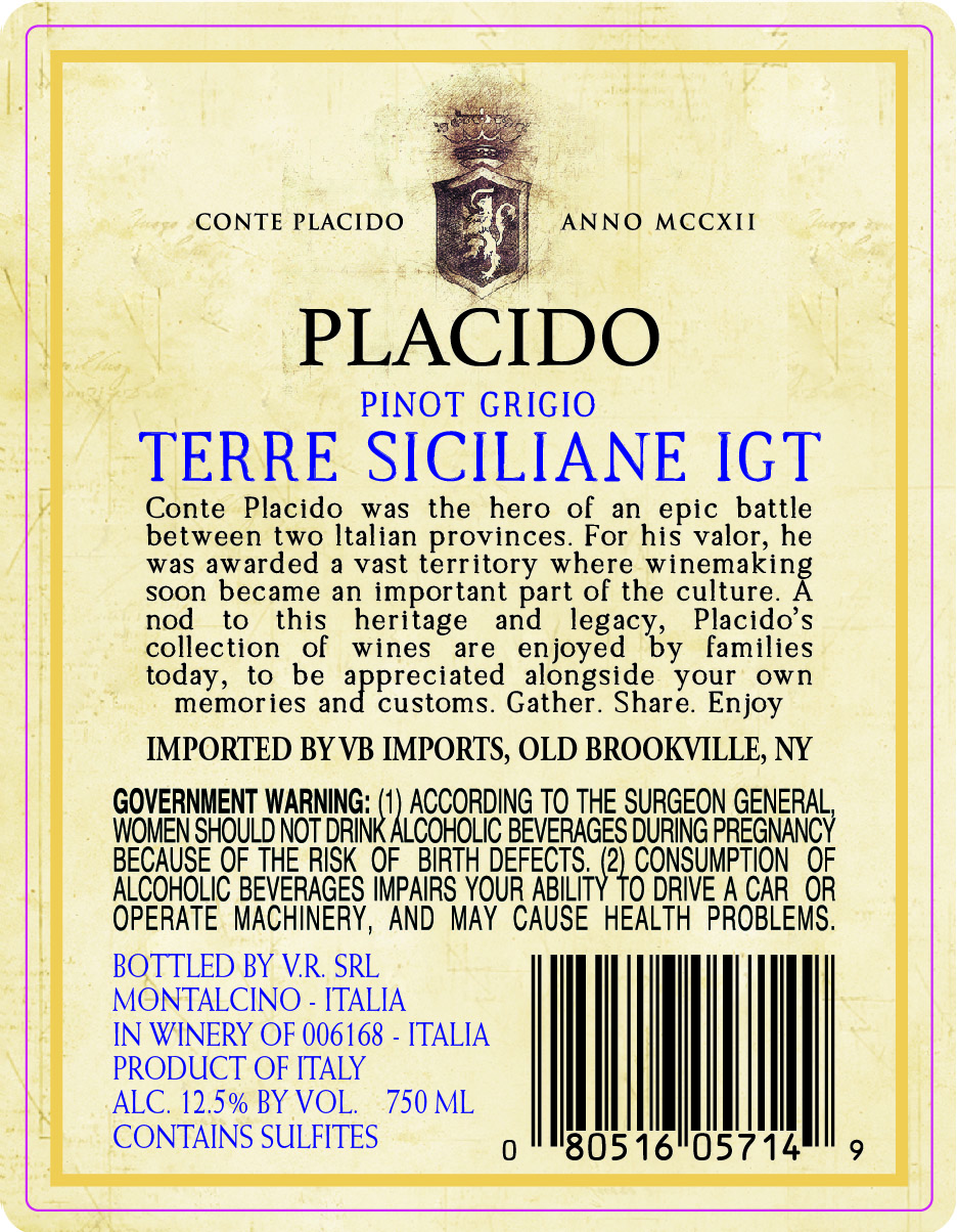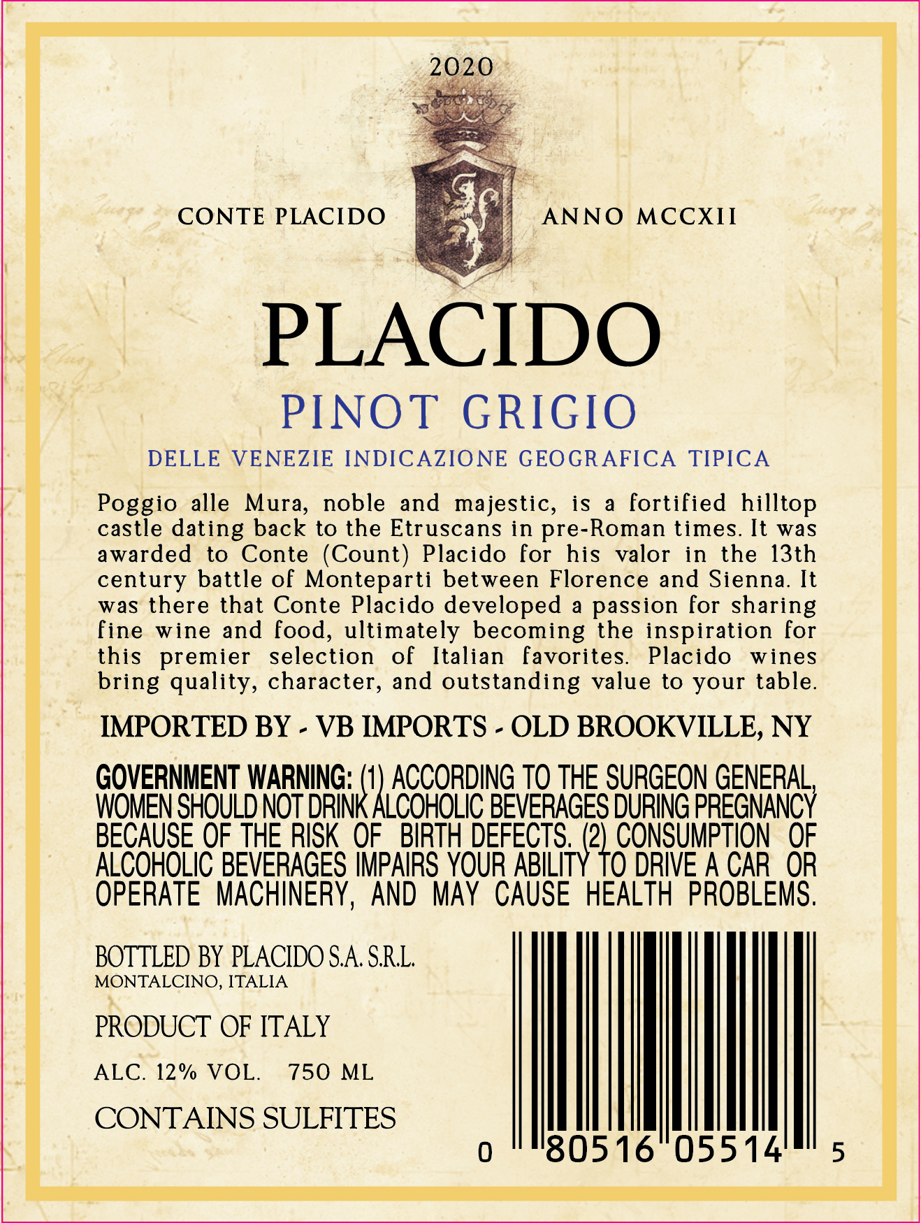 Placido Pinot Grigio is a delightful aperitif, and is perfect for a range of foods including appetizers, fresh salads, seafood, and grilled poultry.
