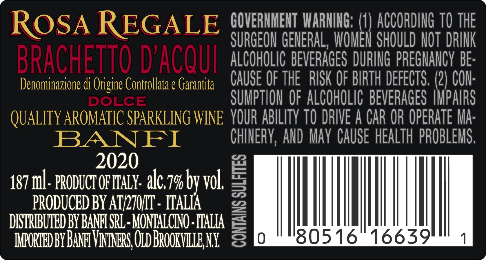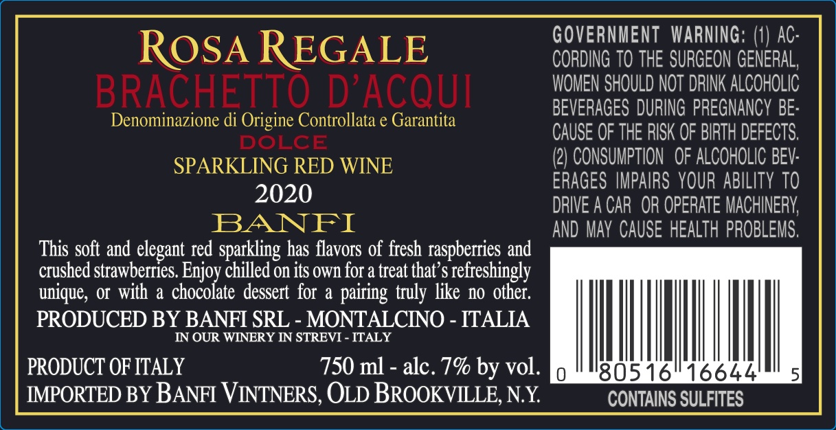 Rosa Regale is produced using the Charmat process, fermentation with brief skin contact, fi ltration and storage at 32°F, followed by refermentation in stainless-steel vats, and isobaric bottling.
