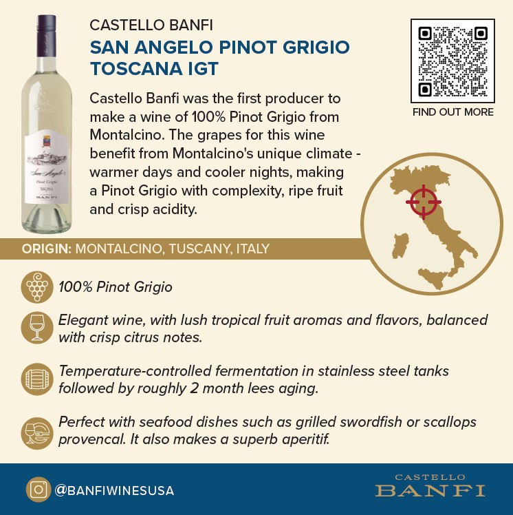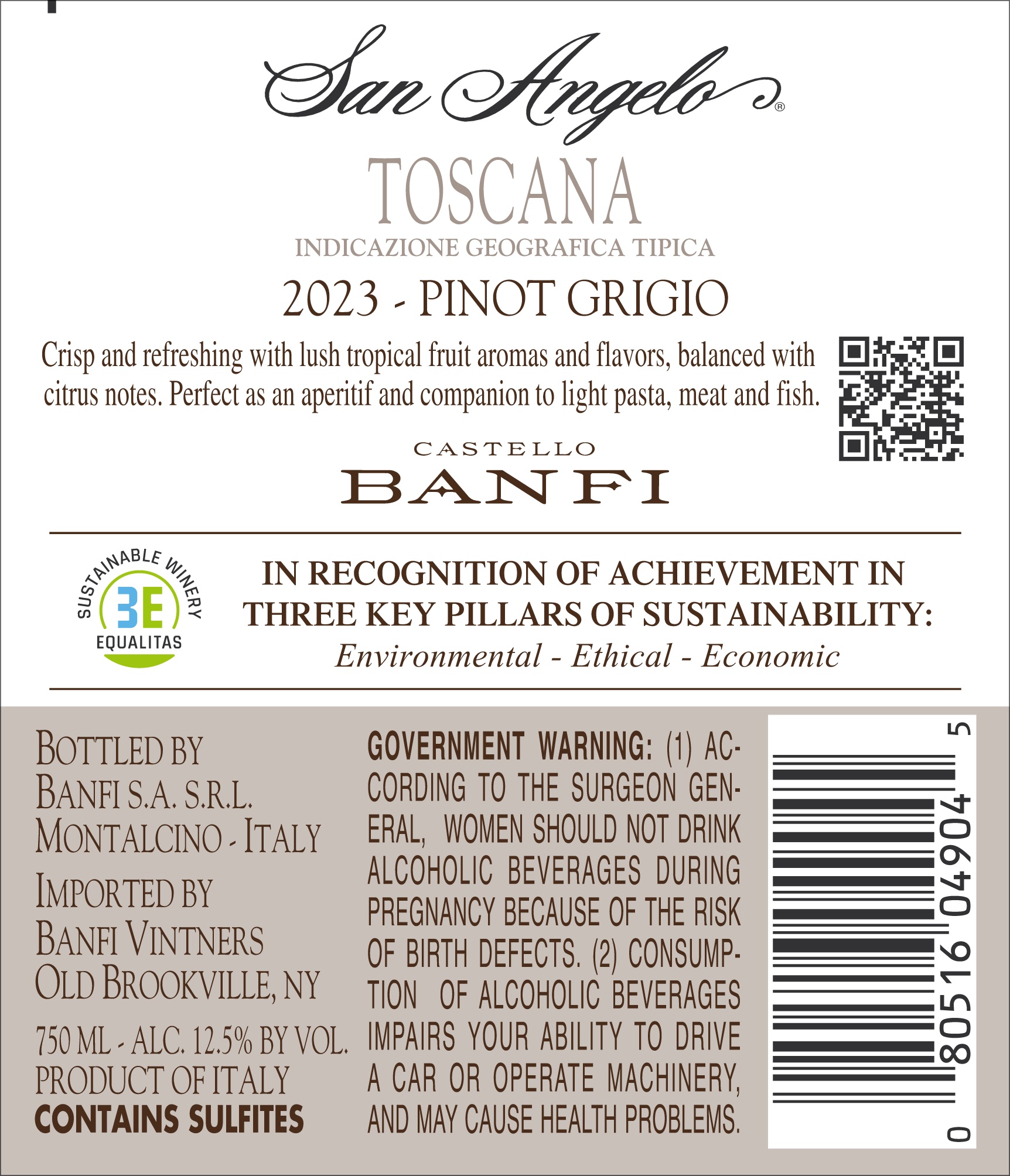 San Angelo Pinot Grigio is an elegant wine. Lush tropical fruit aromas and flavors, balanced with crisp citrus notes, reflect its unique Tuscan character and distinguish San Angelo Pinot Grigio from its northern counterparts.
