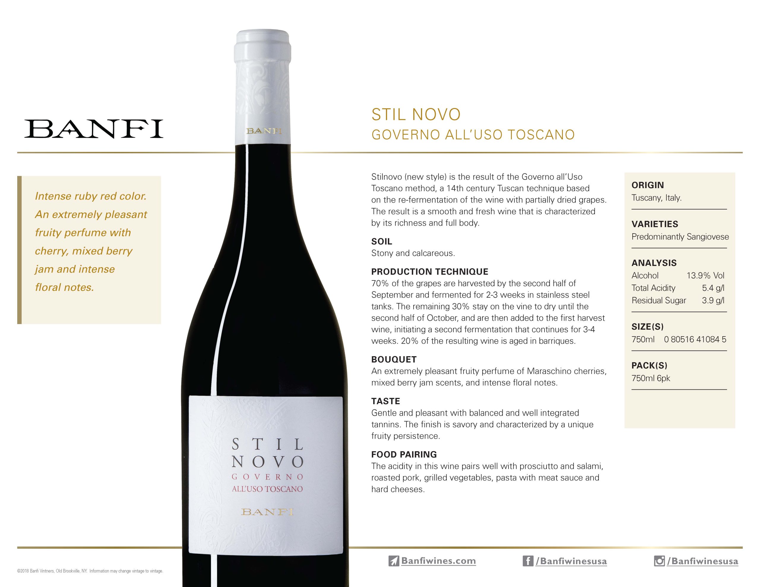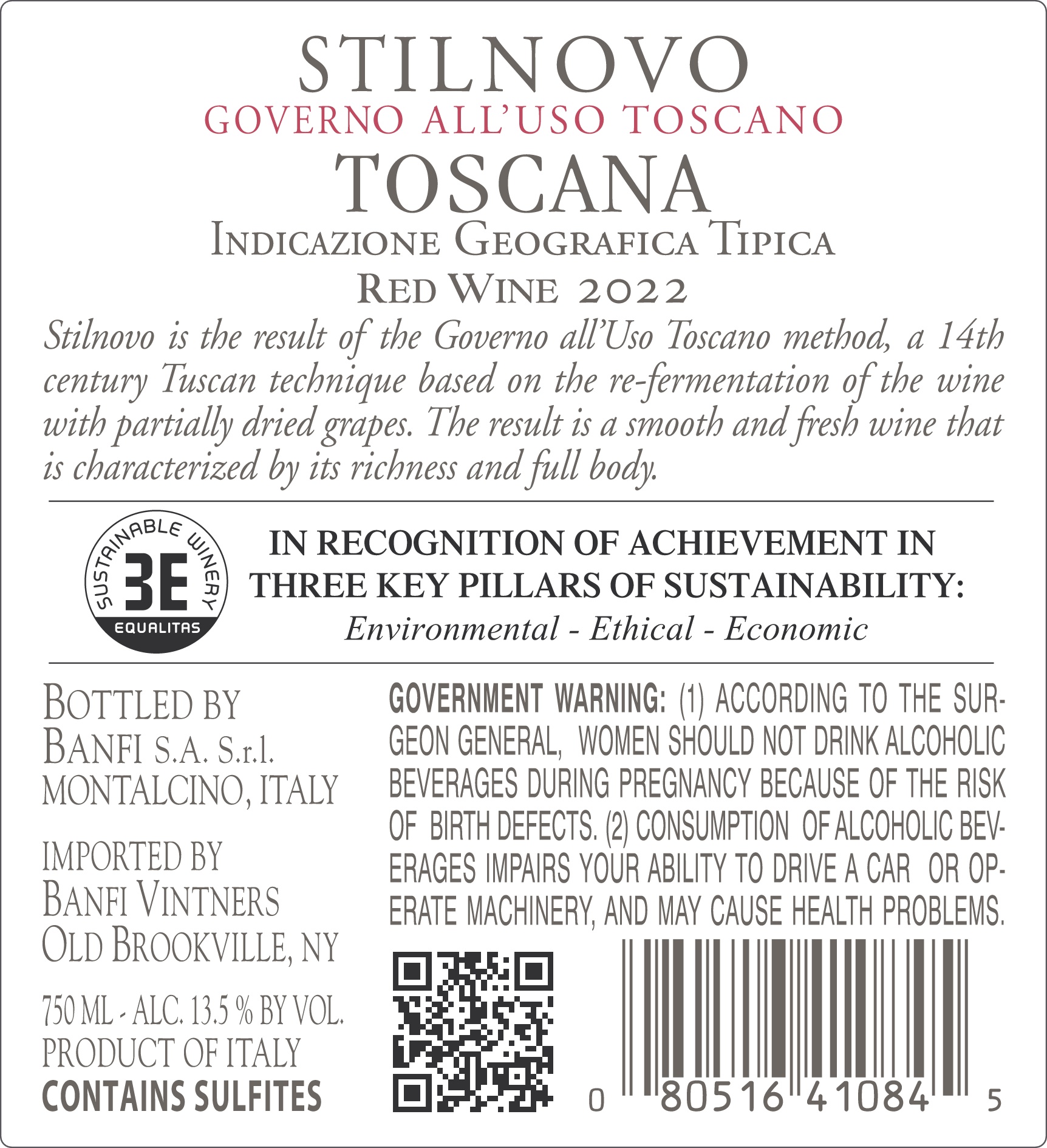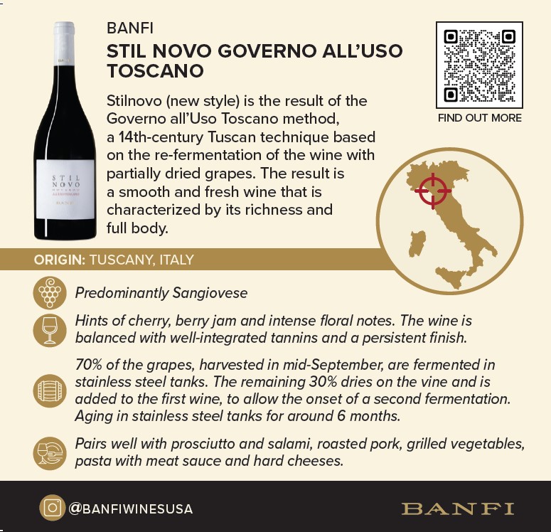 Stilnovo (new style) is the result of the Governo all’Uso Toscano method, a 14th-century Tuscan technique based on the re-fermentation of the wine with partially dried grapes. The result is a smooth and fresh wine that is characterized by its richness and full body.