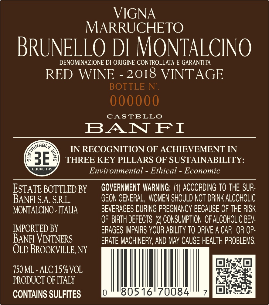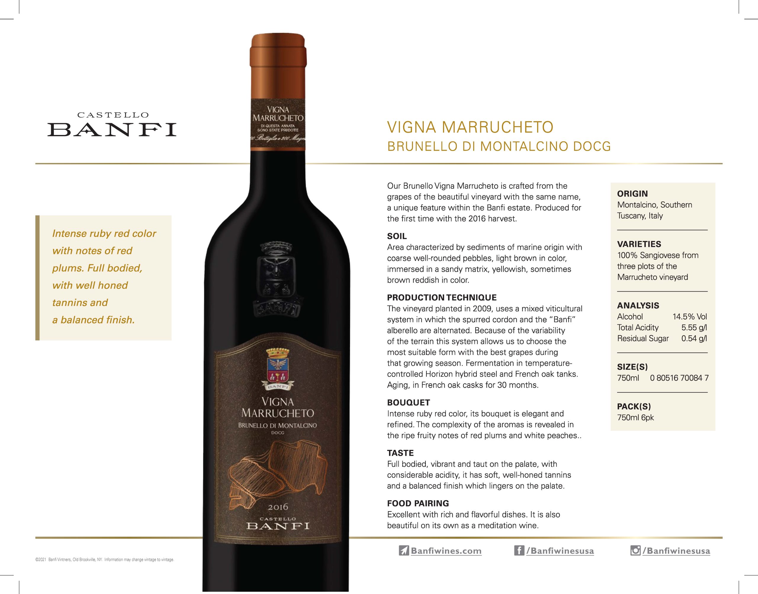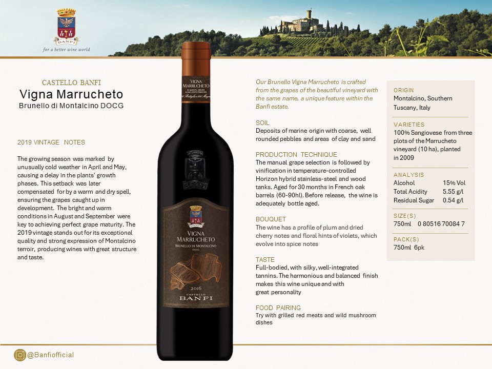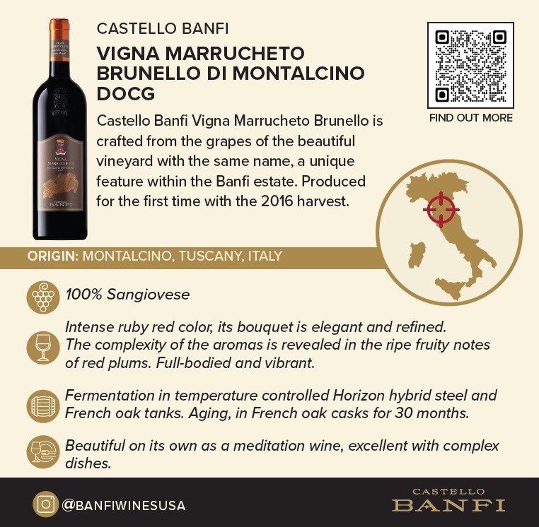 Our Brunello Vigna Marrucheto is crafted from the grapes of the beautiful vineyard with the same name, a unique feature within the Banfi estate. Produced for the first time with the 2016 harvest.
