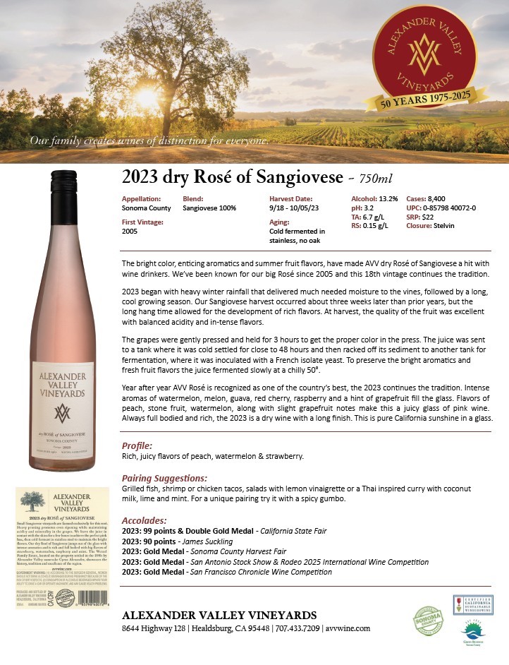 The bright color, enticing aromatics and summer fruit flavors, have made AVV dry Rosé of Sangiovese a hit with wine drinkers. We’ve been known for our big Rose’ since 2005.