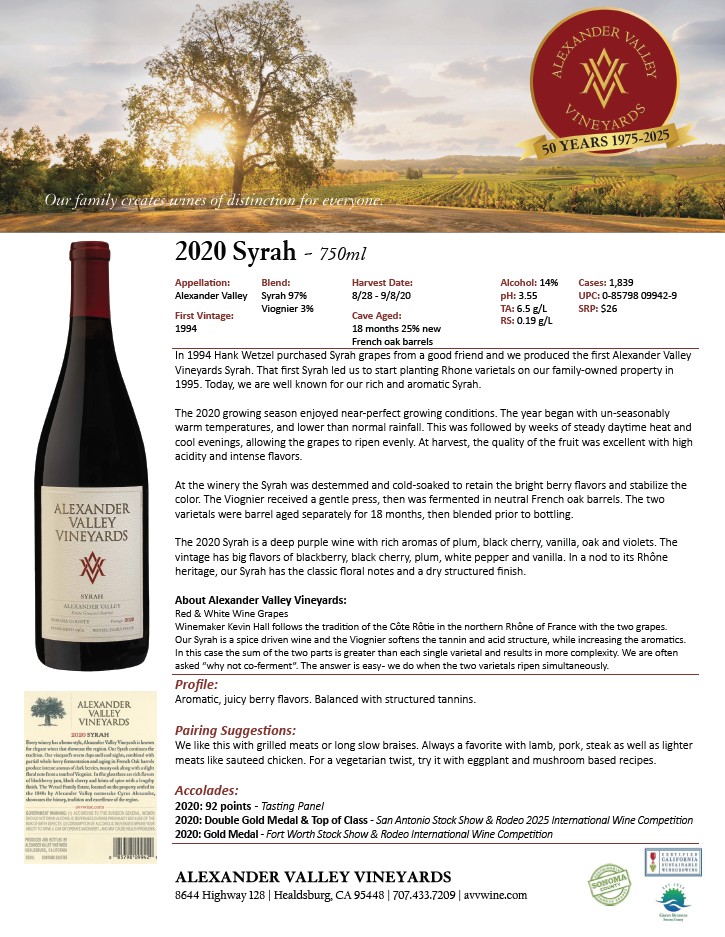 Our first vintage of Syrah in 1994 was made from purchased fruit, but that wine was the inspiration for us to begin planting Rhone varietals on our family-owned property in 1995. Today, we are well known for our rich and aromatic Syrah. Loads of juicy berry flavors, a little spice, a wisp of violet and a hint of smokiness from the barrel aging make this a top Syrah.